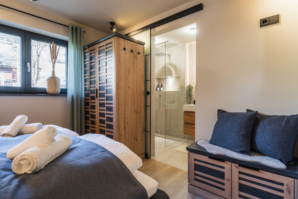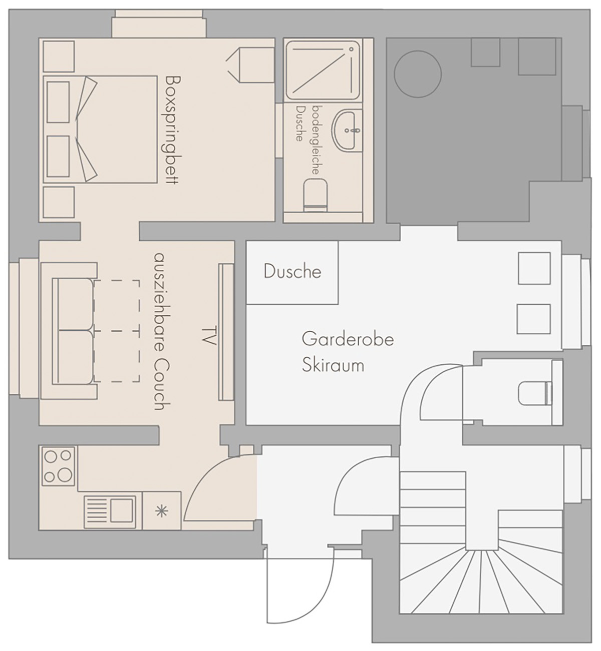 Im Erdgeschoss gelegen, bietet das Untasteani alles, was man zum Entspannen braucht: Eine kompakte neue Küche, ein bequemes Schlafsofa, ein großes Boxspringbett mit indirekter Beleuchtung und ein modernes Bad mit Dusche und WC. Ideal für Paare oder kleine Auszeiten am Berg.