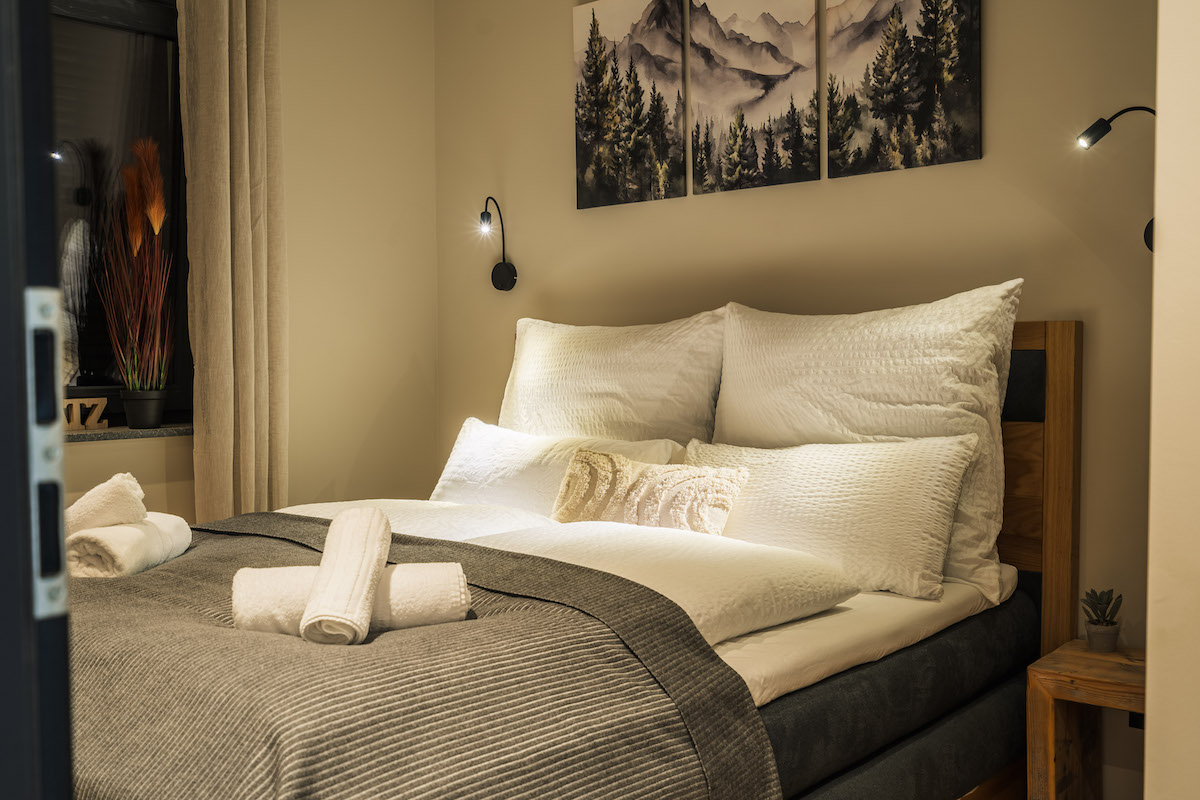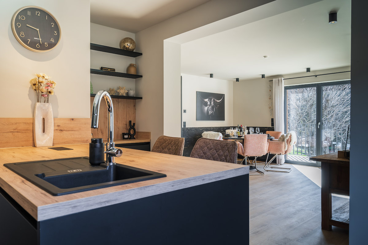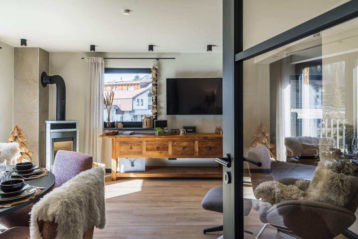 Im ersten Obergeschoss wartet unsere großzügige Zirbensuite mit einer modernen Küche samt Kochinsel, einer Terrasse für gemütliche Mahlzeiten im Freien und einer einladenden Stube mit Flat-TV. Zwei Schlafzimmer – eines mit Doppel-Boxspringbett, eines mit zwei Einzelbetten – sowie ein Bad mit Dusche und Badewanne und ein separates Gäste-WC machen den Aufenthalt perfekt.