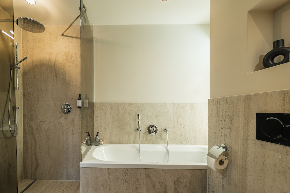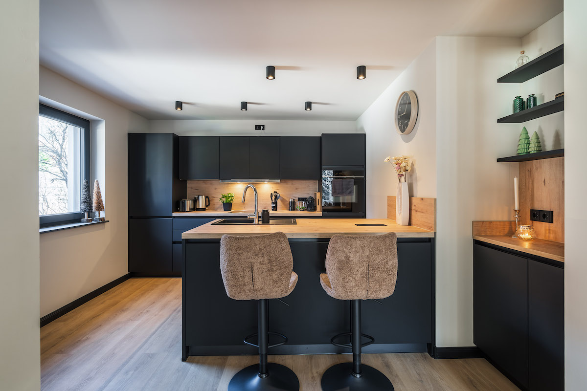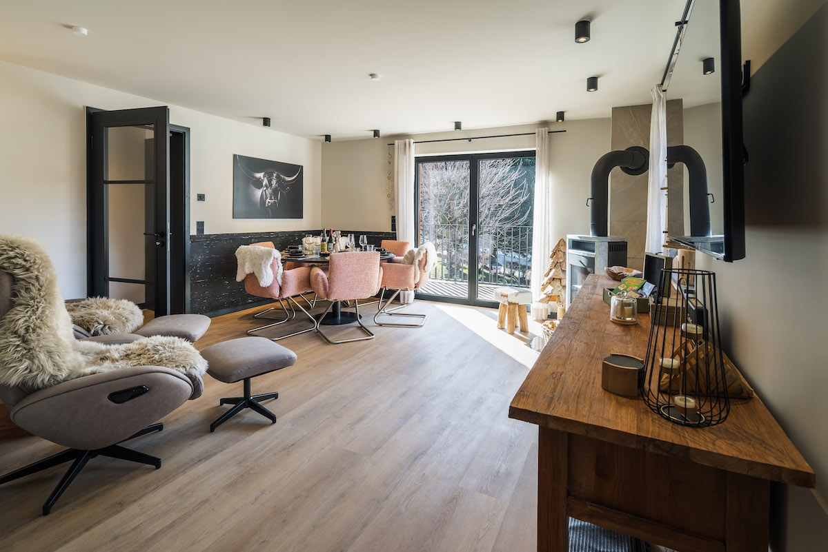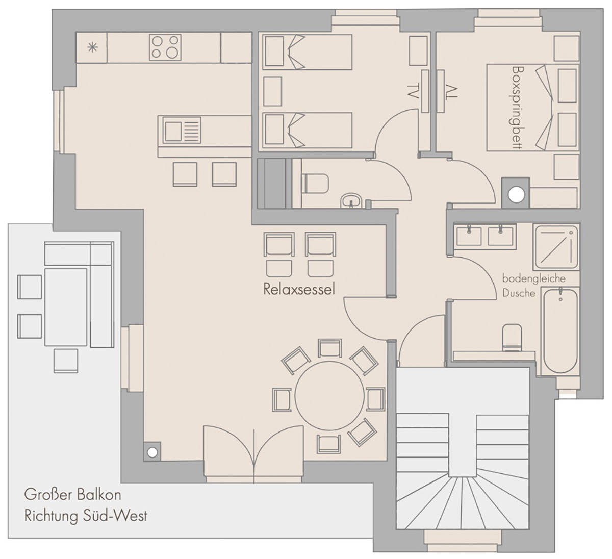 Im ersten Obergeschoss wartet unsere großzügige Zirbensuite mit einer modernen Küche samt Kochinsel, einer Terrasse für gemütliche Mahlzeiten im Freien und einer einladenden Stube mit Flat-TV. Zwei Schlafzimmer – eines mit Doppel-Boxspringbett, eines mit zwei Einzelbetten – sowie ein Bad mit Dusche und Badewanne und ein separates Gäste-WC machen den Aufenthalt perfekt.
