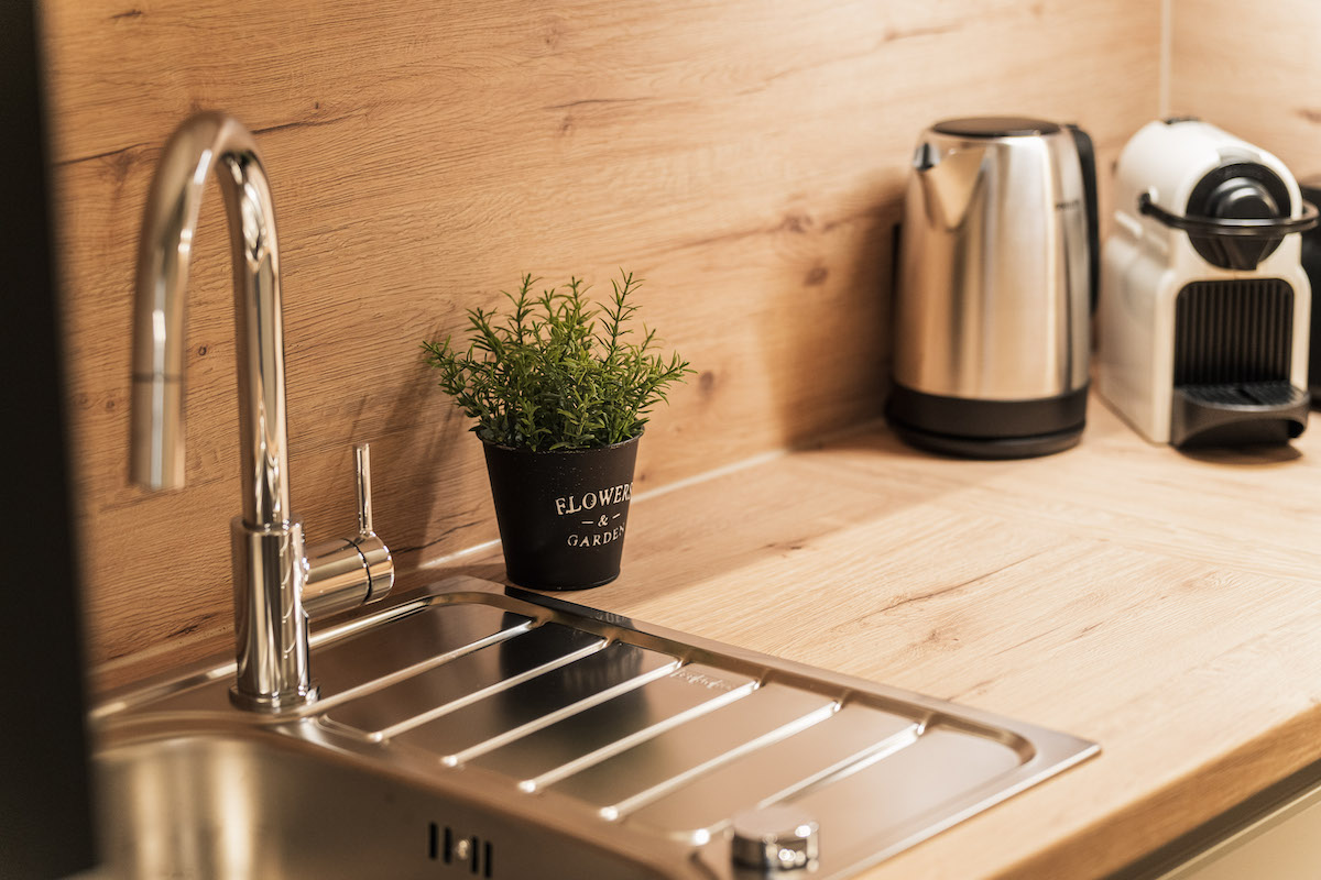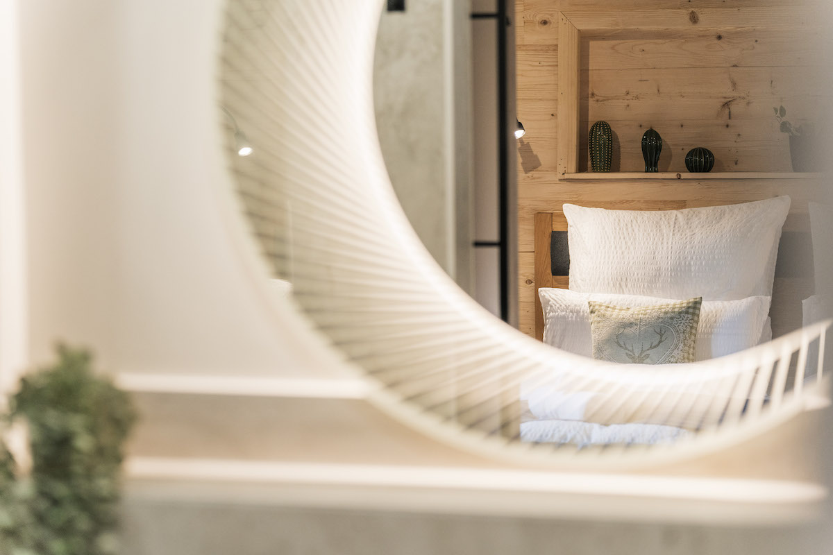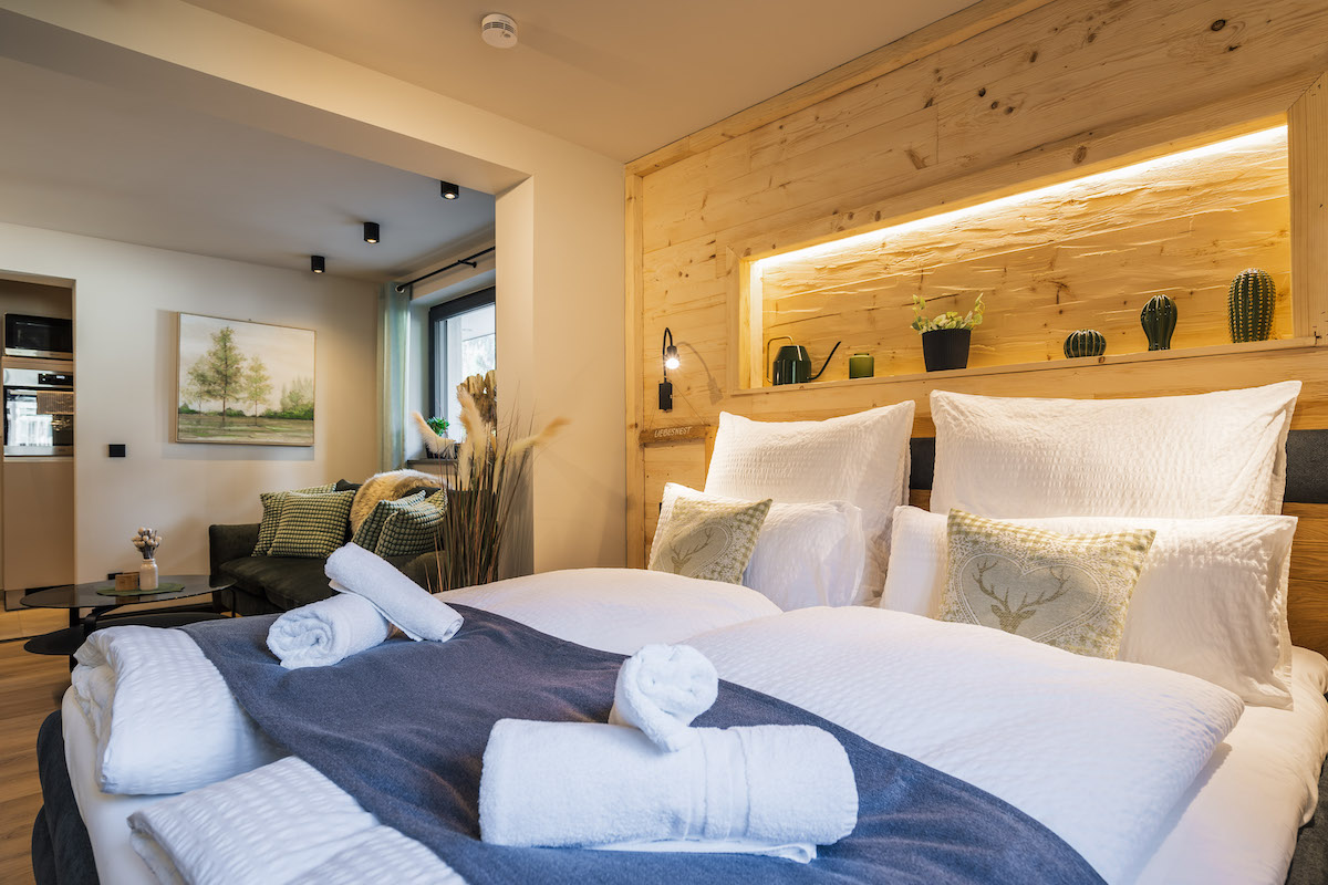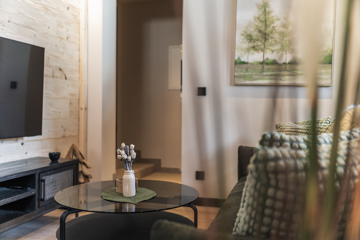 Im Erdgeschoss gelegen, bietet das Untasteani alles, was man zum Entspannen braucht: Eine kompakte neue Küche, ein bequemes Schlafsofa, ein großes Boxspringbett mit indirekter Beleuchtung und ein modernes Bad mit Dusche und WC. Ideal für Paare oder kleine Auszeiten am Berg.