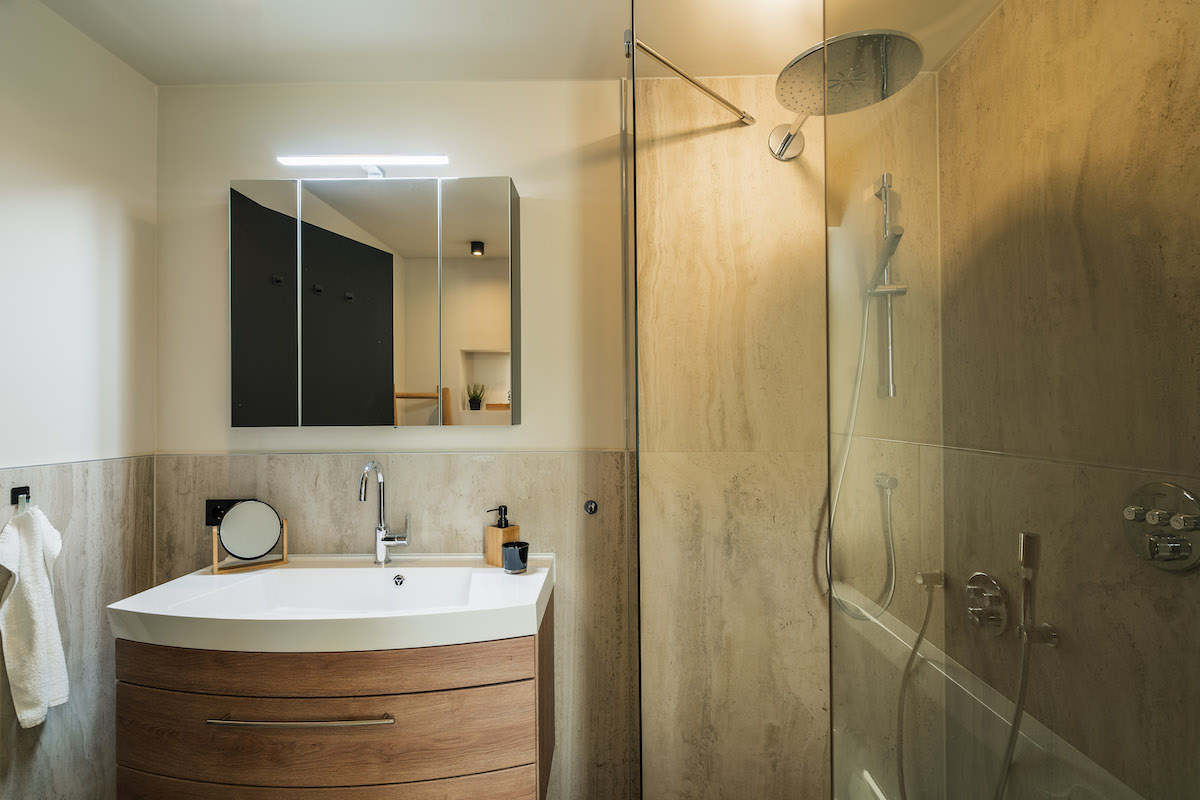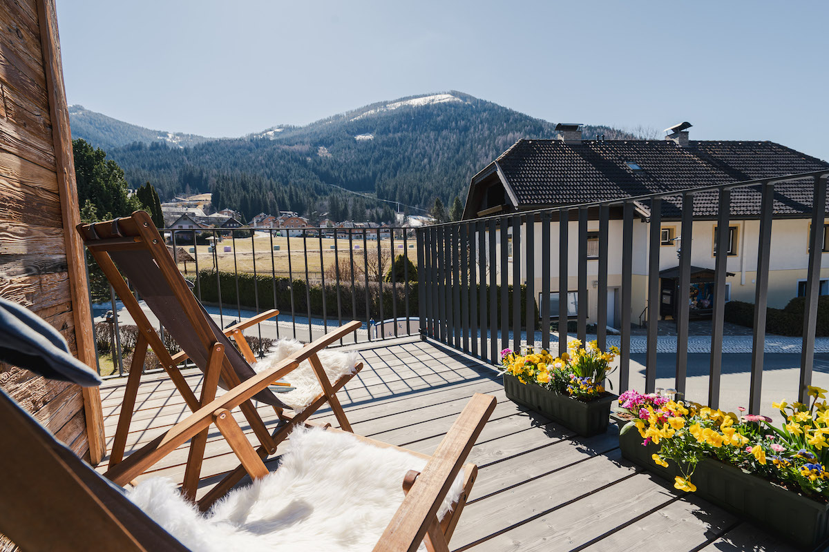 Im ersten Obergeschoss wartet unsere großzügige Zirbensuite mit einer modernen Küche samt Kochinsel, einer Terrasse für gemütliche Mahlzeiten im Freien und einer einladenden Stube mit Flat-TV. Zwei Schlafzimmer – eines mit Doppel-Boxspringbett, eines mit zwei Einzelbetten – sowie ein Bad mit Dusche und Badewanne und ein separates Gäste-WC machen den Aufenthalt perfekt.